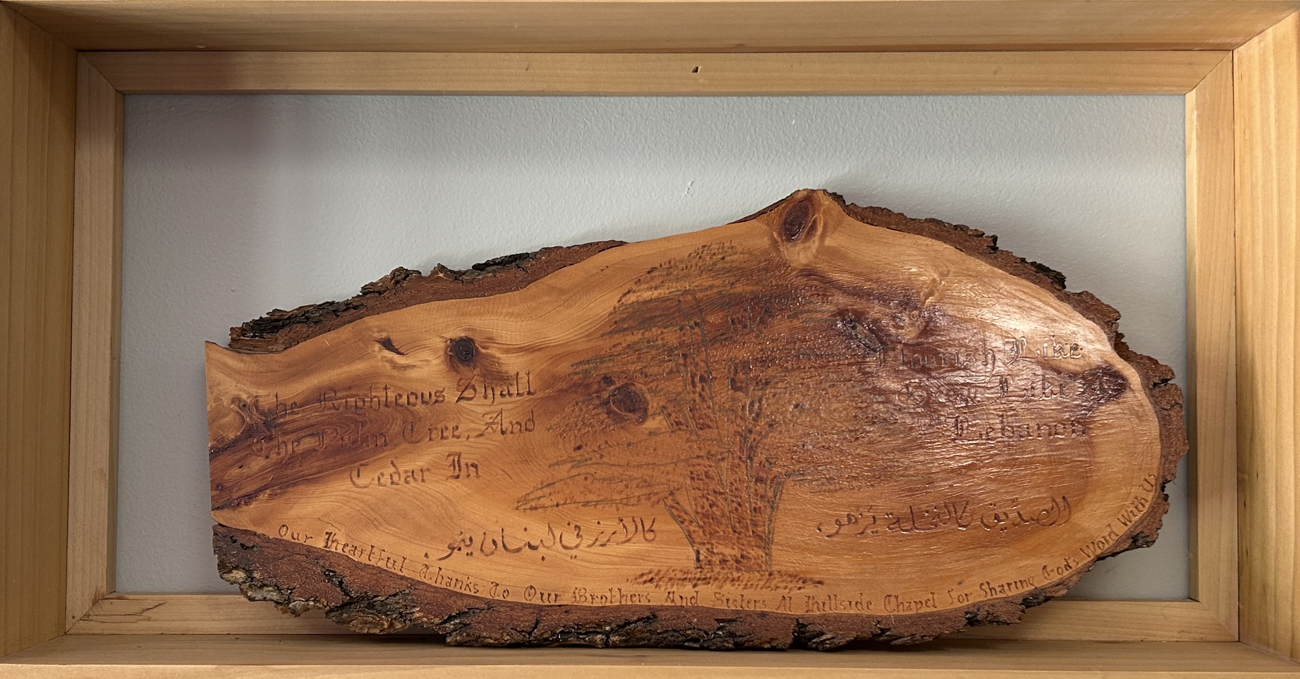 God turned a dream of 50 Bibles into 500 by the faithful obedience and generosity of a few. 400 of these bibles were distributed to families in 3 villages in northern Lebanon. Another 100 were given to jail inmates who expressed a desire for God’s Word. This Lebanese Cedar was gifted in return for God’s blessing to these families. On it, the blessing of Psalm 92:12 is engraved: “The righteous shall flourish like a palm tree, He shall grow like a cedar in Lebanon.”